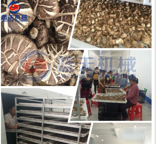 1:準備好物料:采收前一天禁止?jié)菜?適時采收。香菇應在四五成熟時采收,一般采收均不能超過八成熟。采收的香菇分好類,先在陽光下暴曬2-3小時,以去除部分水分。裝盤時使菌蓋朝上,菌柄朝下,擺均放正,不可重疊積壓,以防傷菇而影響質量。香菇采收后6小時以內必須烘烤,如果有冷藏條件,保存時間可適當延長。