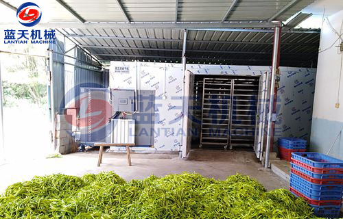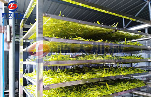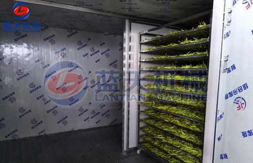 先把黃花菜均勻的攤放在推車托盤上,推車托盤最要用不銹鋼制作的,有利于加快干燥的時間。每層大約攤放7公分厚。層與層之間要預(yù)留8公分的距離,確保每層的通風(fēng)效果。一部推車最好不要超過15層。裝好后放在烘干房內(nèi)。