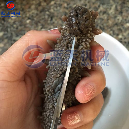 第一步:海參剪口擠腸:海參用清水清洗一下,從其腹部用剪子剪開兩三厘米的口,將內(nèi)臟及腸子取出,不去掉腸子,整個(gè)海參都會(huì)化掉。