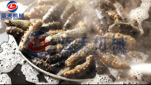 第三步:蒸煮海參:當(dāng)水溫在90度時(shí),將清洗好的海參放入鍋里蒸煮,用工具來(lái)回?cái)嚢?,防止水溫不均,這時(shí)可見到海參迅速縮小,海參刺明顯突出。約半小時(shí)后,撈出海參,視情況拌入粗鹽。