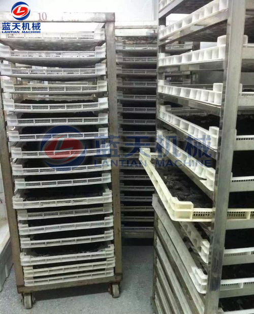 第四步:海參烘干:將煮好的海參擺放在物料盤上,將擺好海參的物料盤放置入空氣能熱泵海參烘干機(jī)內(nèi),通過(guò)智能控制系統(tǒng)設(shè)置烘干溫度、濕度和時(shí)間參數(shù),開始干燥。