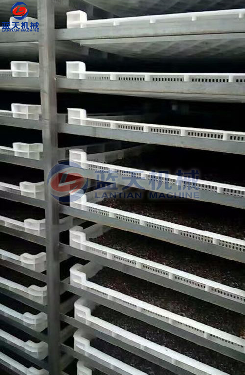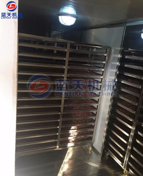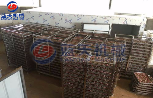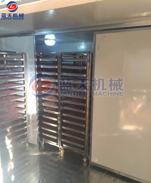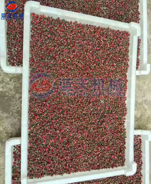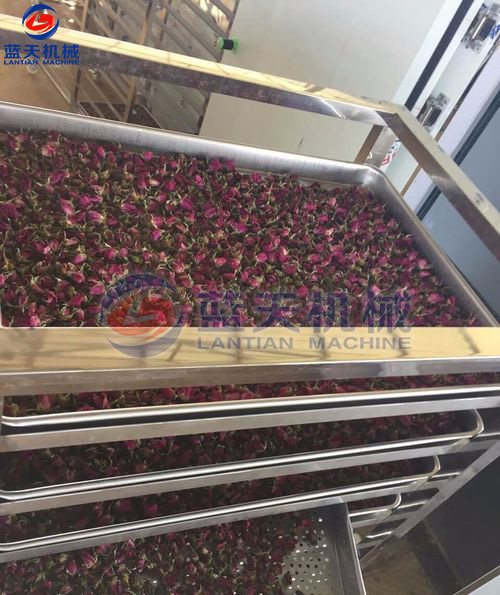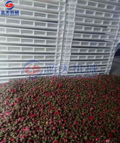 裝滿花蕾的物料車(chē)要輕輕推入烘干房,關(guān)閉烘干房室門(mén)升溫,嚴(yán)格控制室內(nèi)溫度、依次順序溫度慢慢提升,采用循環(huán)風(fēng)路,確?;ɡ俑蓾窬鶆?,色澤鮮艷。