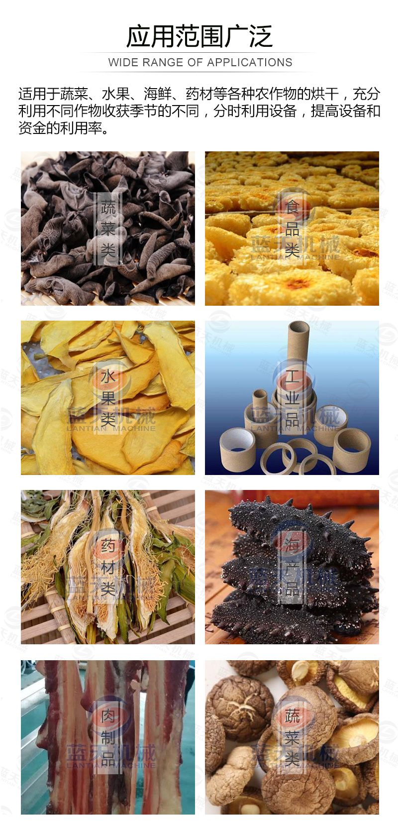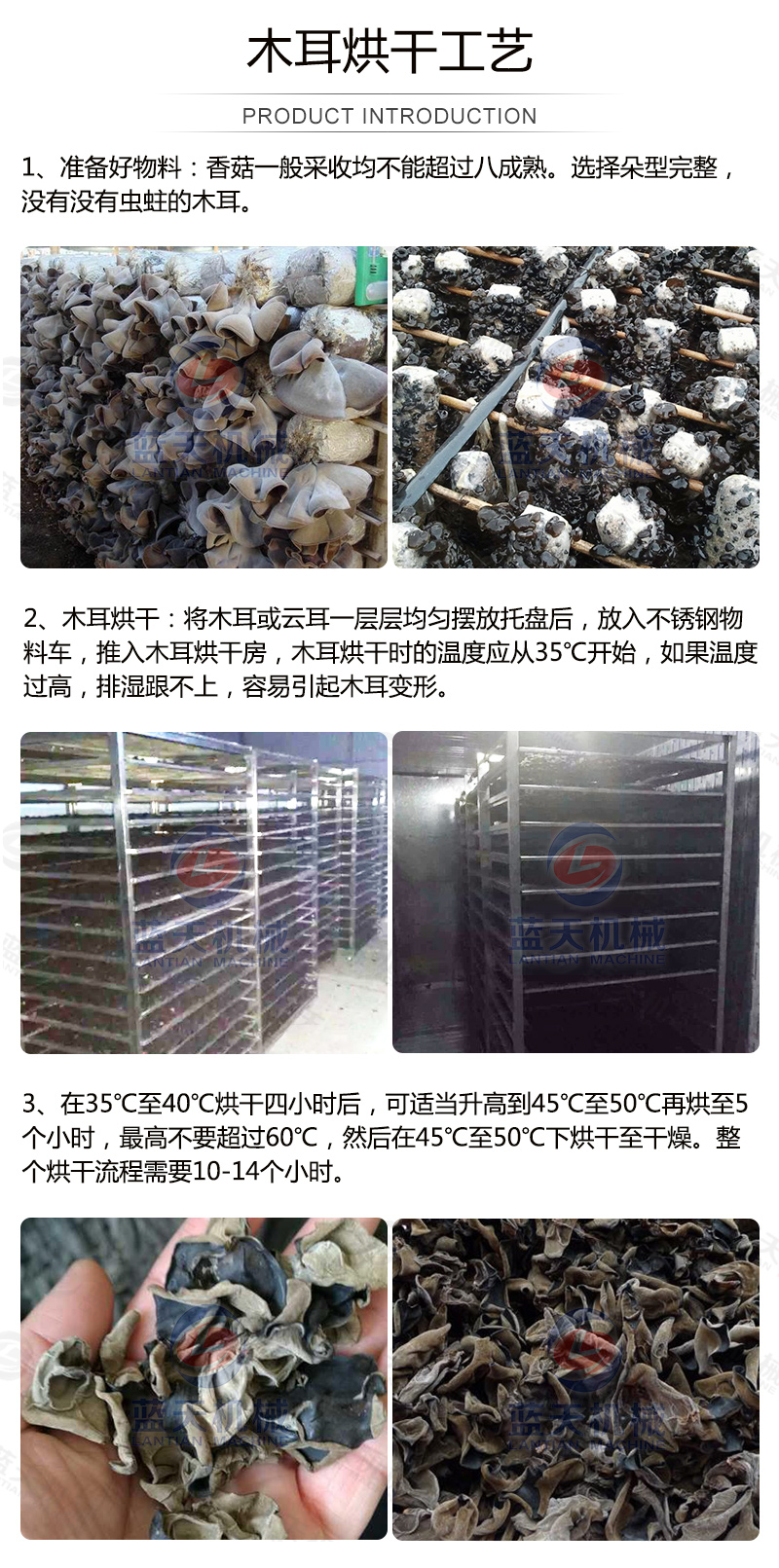 三:設定木耳烘干機的運行參數,要注意在整個木耳烘干過程中前段用35-45度低溫主要進行除去濕度,因為鮮木耳的含水率很大,到中段時可以適當升溫到50度,進行升溫排濕,后一階段觀察木耳含稅率下降情況,可適當升溫到55度,在經過十多個小時的連續(xù)烘干除去濕度后,木耳烘干了。