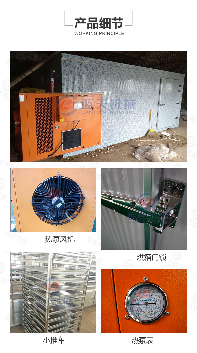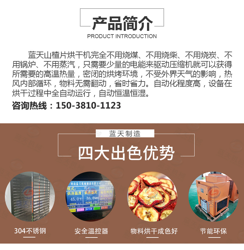 新鮮山楂片的含水率約為80%,烘干的目標(biāo)含水率約為13%,使用空氣能熱泵小型山楂片烘干機(jī),將智能溫度設(shè)定為55度左右的范圍,使山楂片所含的游離水大量蒸發(fā),熱風(fēng)循環(huán)系統(tǒng)不斷輸送新風(fēng),將風(fēng)量均勻的輸送到各層架,排風(fēng),促使蒸發(fā)的水份通過凝結(jié)水管路系統(tǒng)排出。