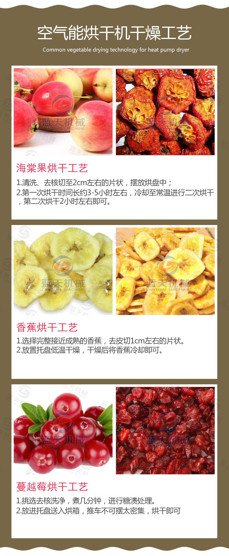 2.葡萄干烘干機(jī)熱泵烘干:托盤裝載量14~20kg/m~2,初溫45~50℃,終溫70~75℃;烘干時(shí)間42~60h。系統(tǒng)除濕量要大,脫水率已達(dá)70%。葡萄全干后仍保持綠色。烘干干燥適度的葡萄干,肉質(zhì)柔軟,用手緊壓無汁液滲出。含水量為 15%~17%,干燥率為3:1~4:1。