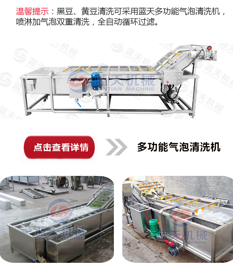 1、原料選擇及清洗:選擇成熟、顆粒飽滿均勻、皮薄肉多、無蟲蝕、無霉爛變質(zhì)、并且有新鮮度的黃豆或黑大豆為宜。用清水多次洗去大豆中混有的砂粒雜質(zhì)等。有條件的可以使用自動化的果蔬清洗機來大批量清洗黑豆。