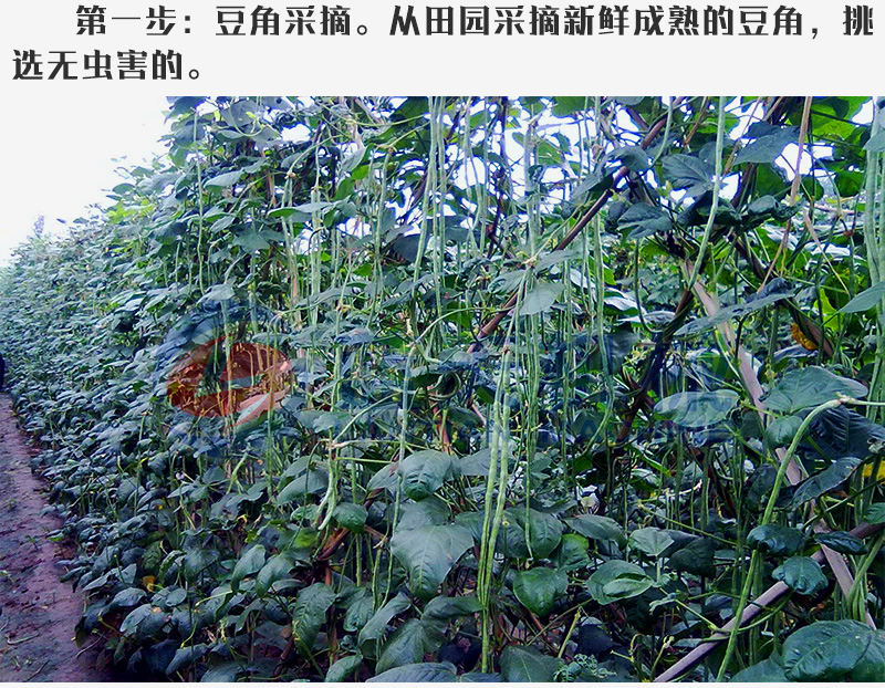 一:豆角采摘。從田園采摘新鮮成熟的豆角,挑選無(wú)蟲(chóng)害的。