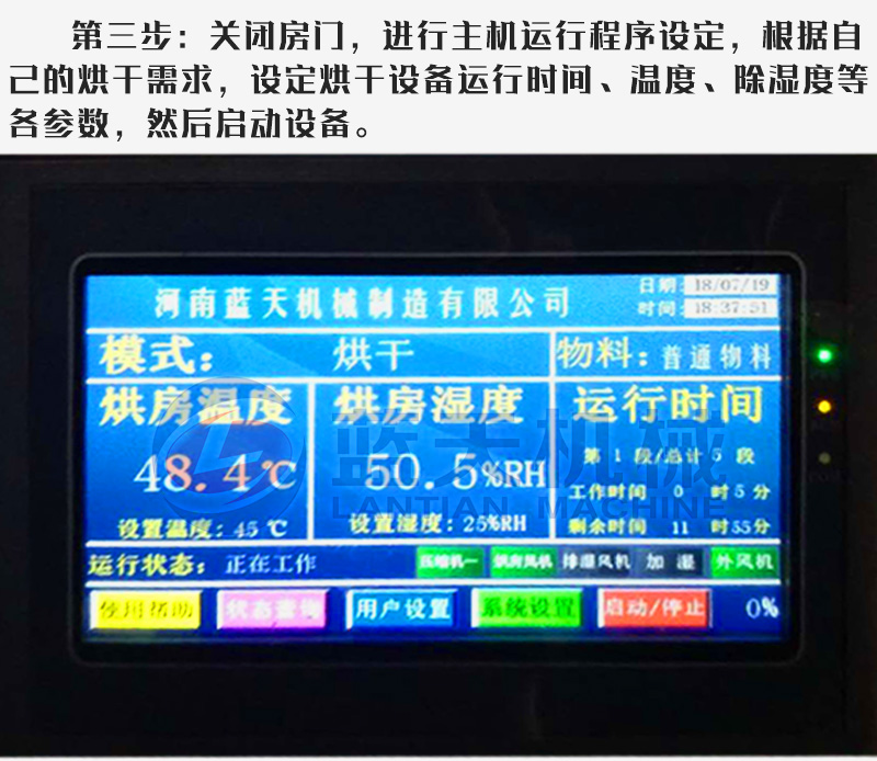 三:將盛放好豆角的物料車(chē)推入豆角烘干機(jī)設(shè)備內(nèi),關(guān)閉房門(mén),進(jìn)行主機(jī)運(yùn)行程序設(shè)定,根據(jù)自己的烘干需求,設(shè)定烘干設(shè)備運(yùn)行時(shí)間、溫度、除濕度等各參數(shù),然后啟動(dòng)設(shè)備。