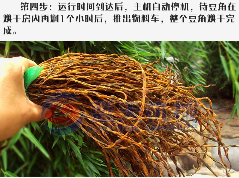 四:運(yùn)行時(shí)間到達(dá)后,主機(jī)自動(dòng)停機(jī),待豆角在豆角烘干機(jī)內(nèi)再燜1個(gè)小時(shí)后,推出物料車(chē),整個(gè)豆角烘干完成。