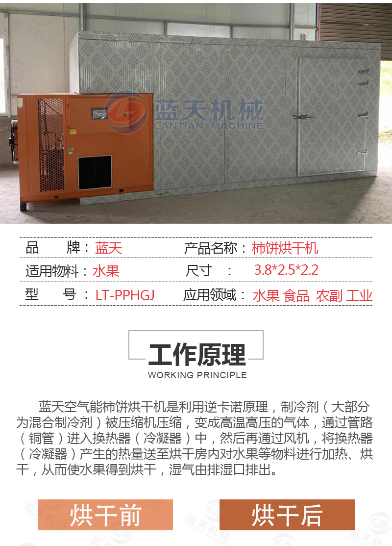 傳統(tǒng)的柿餅的生產(chǎn)周期傳統(tǒng)的自然晾曬所需要的一月有余,而采用熱泵柿餅烘干機(jī)則縮短到4-5天(根據(jù)使用時(shí)的溫濕度確定),并且在質(zhì)量上優(yōu)于自然涼曬的柿餅。在脫澀期溫度不能超過(guò)45度,濕度保持32%上下;前期烘烤期排濕不能太大,以免結(jié)皮太早以及影響回軟過(guò)程;第一次捏餅,第二次捏餅,手要輕,力要?jiǎng)?!大量脫水期溫度不能超過(guò)65度,濕度不能高于45度。統(tǒng)而言之為“兩烘兩停三捏”的全自動(dòng)控制烘干方法。
